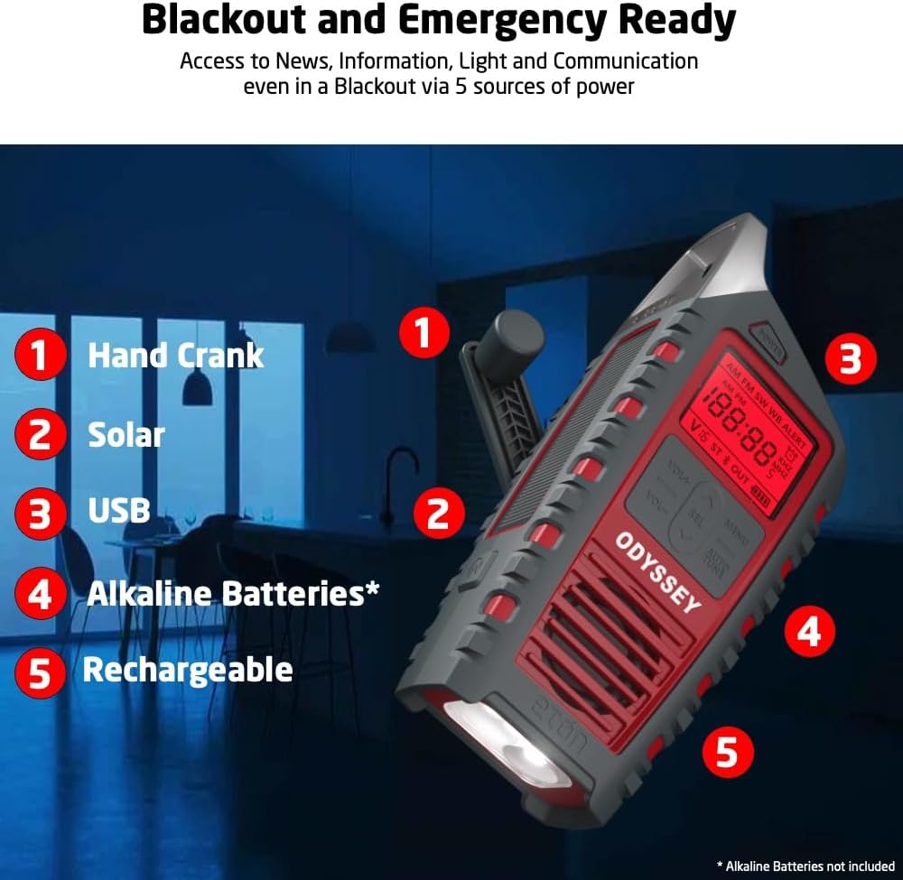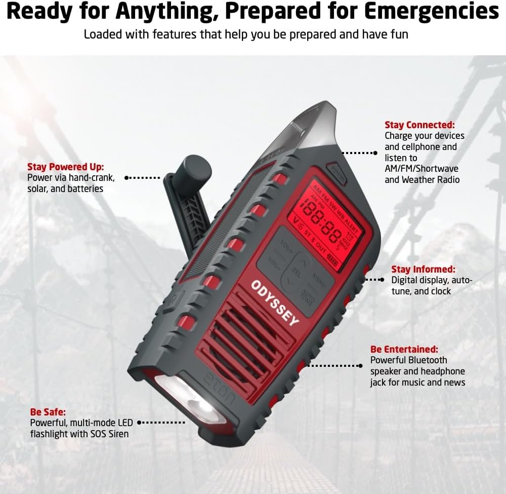 Eton Odyssey Hand Crank NOAA Weather Radio, All Band Emergency Radio, AM/FM Shortwave Storm Radio, Bluetooth, Phone Charger, RDS, Solar, Multi-Function Flashlight, Camping, Hiking