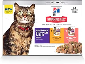 Hill’s Science Diet Sensitive Stomach & Skin, Adult 1-6, Stomach & Skin Sensitivity Support, Wet Cat Food, Variety Case: Chicken & Beef; Salmon & Tuna Stew, 2.8 oz Pouch Variety Case, Case of 12